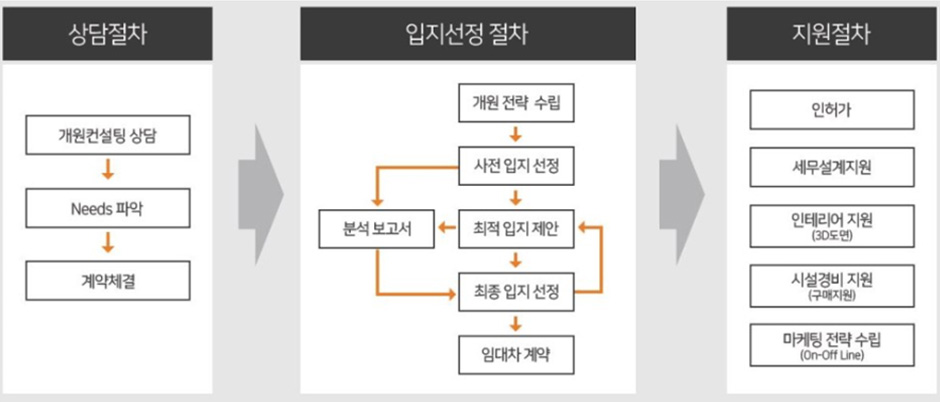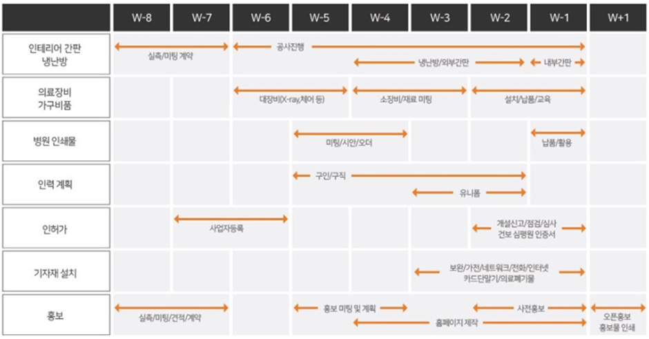 사업계획 → 임대계약 → 행정 → 인테리어 → 마케팅 → 진료시스템 → 장비 → 각종 디자인 → 세무, 회계관리 → 직원관리 → 개원